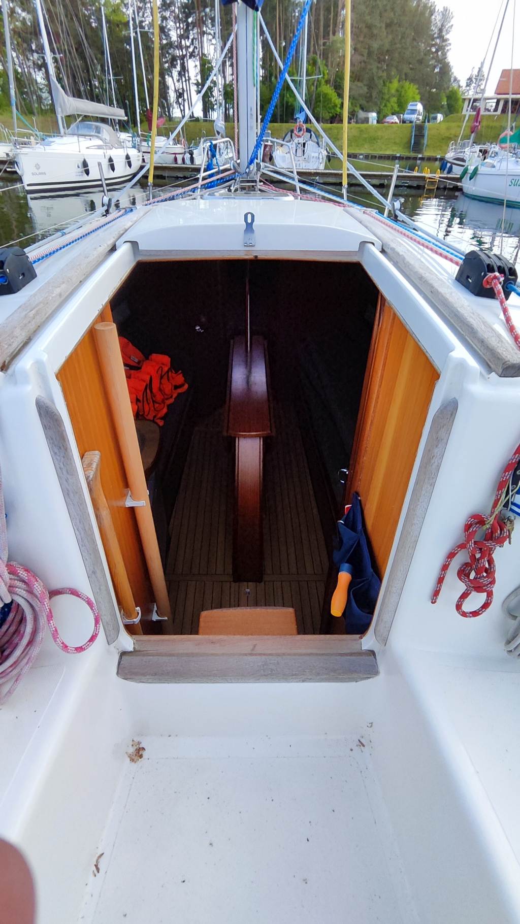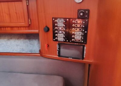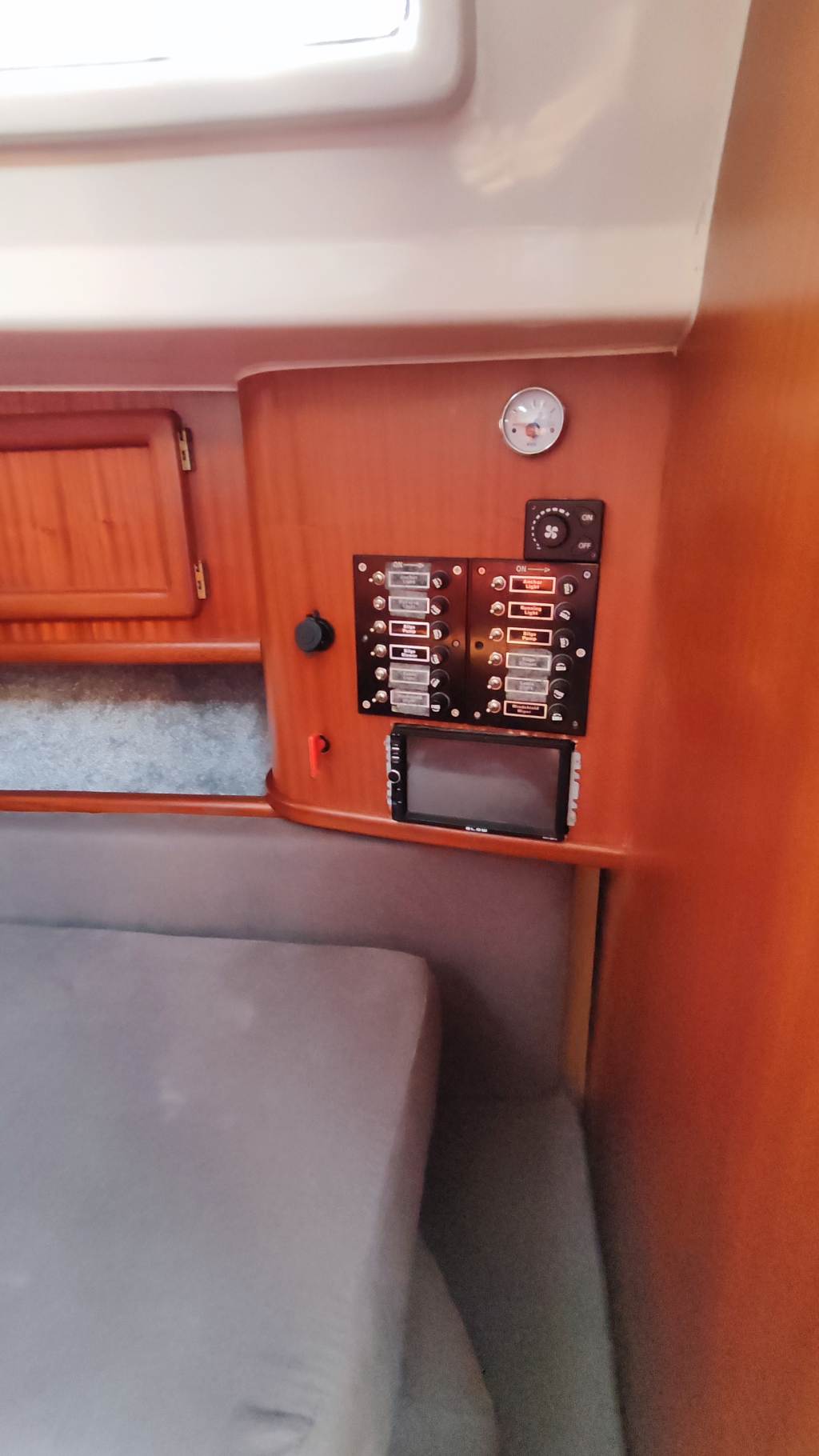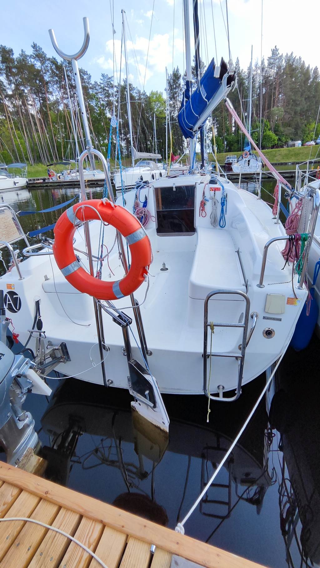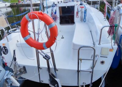 Grot na pełzaczach, patent do stawiania masztu: bramka, rolfok na sztywnym szatgu, lazy Jack, 2 refbanty, tent przeciwdeszczowy, relingi, drabinka rufowa (kąpielowa), środki ratunkowe, kuchenka gazowa, instalacja wody pitnej, ogrzewanie, zastawa stołowa, wyposażenie do gotowania, stolik w kokpicie, WC chemiczne, zamykana kabina WC, prostownik, instalacja 12 i 230V, zbiornik wody 60l., zbiornik paliwa 15l.
