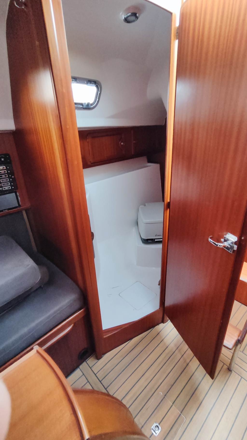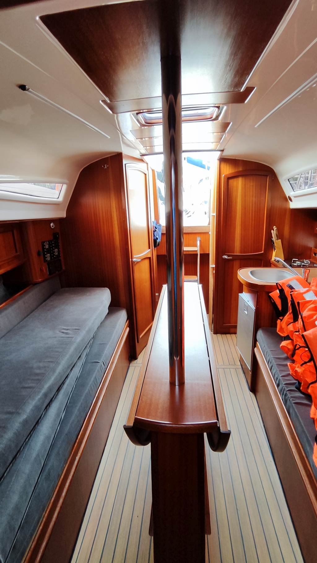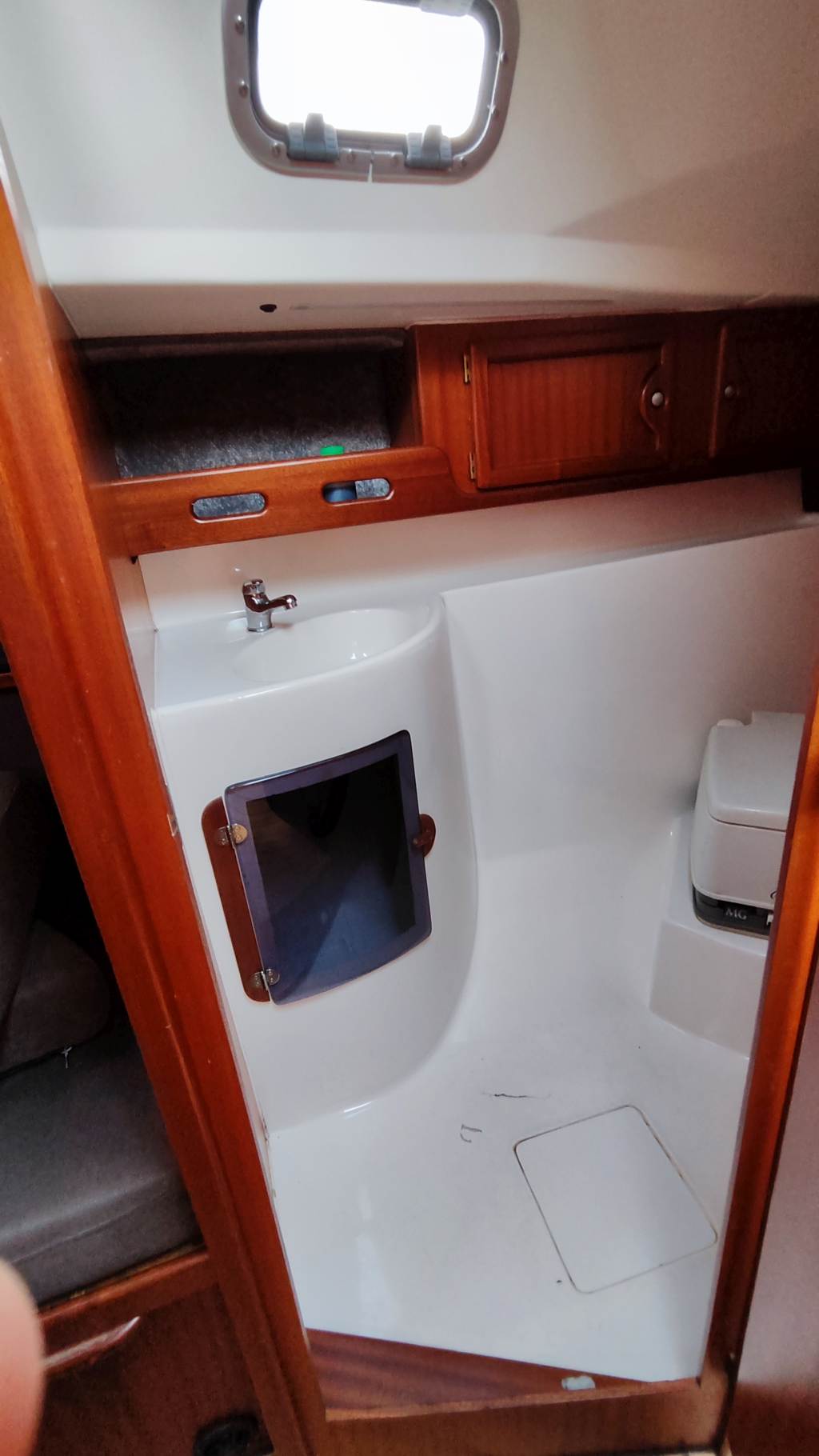 Grot na pełzaczach, patent do stawiania masztu: bramka, rolfok na sztywnym szatgu, lazy Jack, 2 refbanty, tent przeciwdeszczowy, relingi, drabinka rufowa (kąpielowa), środki ratunkowe, kuchenka gazowa, instalacja wody pitnej, ogrzewanie, zastawa stołowa, wyposażenie do gotowania, stolik w kokpicie, WC chemiczne, zamykana kabina WC, prostownik, instalacja 12 i 230V, zbiornik wody 60l., zbiornik paliwa 15l.