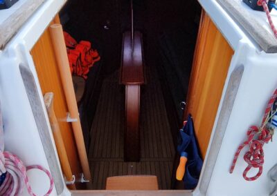 żagle : fok z rolerem (sztywny sztag), grot pełnolistwowy na pełzaczach, pokrowiec bomowy, Lazy Jack, rama do opuszczania masztu, tent na bom.