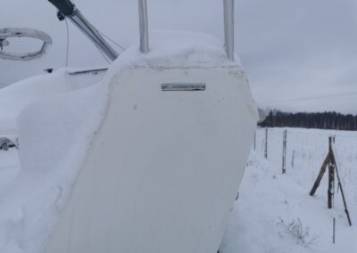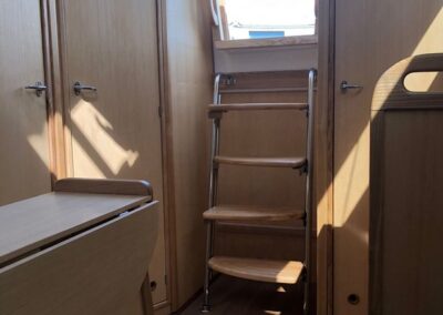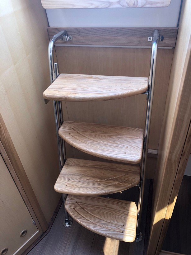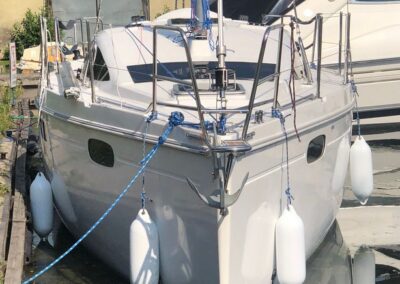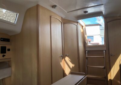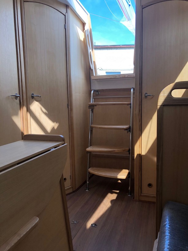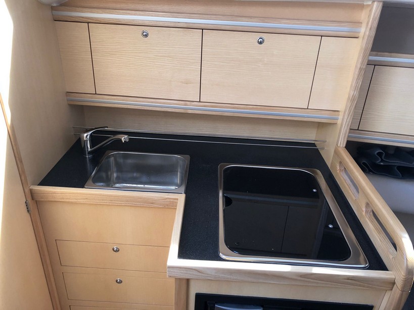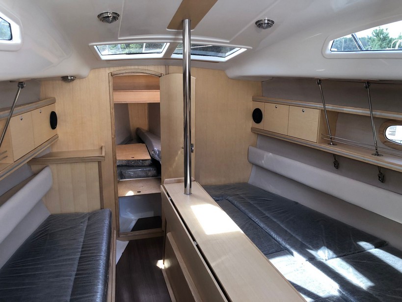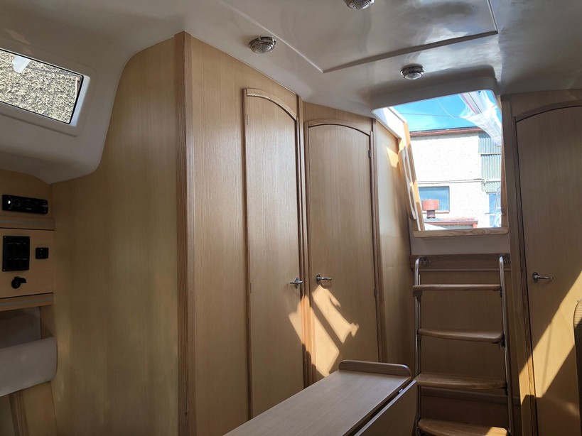 Grot na pełzaczach, patent do stawiania masztu: bramka, rolfok na sztywnym szatgu, lazy Jack, 2 refbanty, tent przeciwdeszczowy, relingi, drabinka rufowa (kąpielowa), środki ratunkowe, kuchenka gazowa, instalacja wody pitnej, ogrzewanie, ciepła woda, zastawa stołowa, wyposażenie do gotowania, stolik w kokpicie, WC chemiczne, zamykana kabina WC, prostownik, instalacja 12 i 230V, zbiornik wody 80l., zbiornik paliwa 15l.