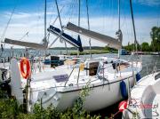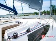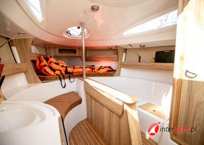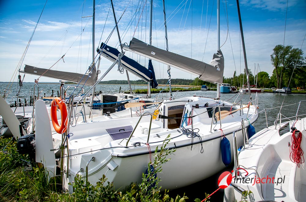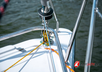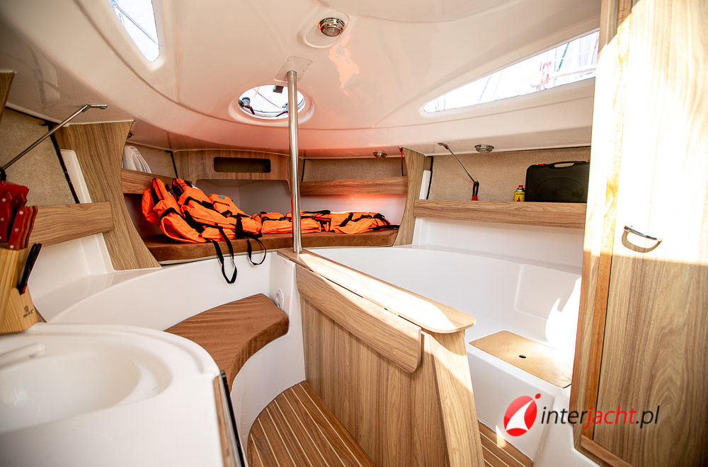 Grot na pełzaczach, patent do stawiania masztu: bramka, rolfok na sztywnym szatgu, lazy Jack, 2 refbanty, tent przeciwdeszczowy, relingi, drabinka rufowa (kąpielowa), środki ratunkowe, kuchenka gazowa, instalacja wody pitnej, woda zaburtowa, zastawa stołowa, wyposażenie do gotowania, stolik w kokpicie, WC chemiczne, zamykana kabina WC, prostownik, instalacja 12 i 230V, zbiornik wody 20l., zbiornik paliwa 5l.